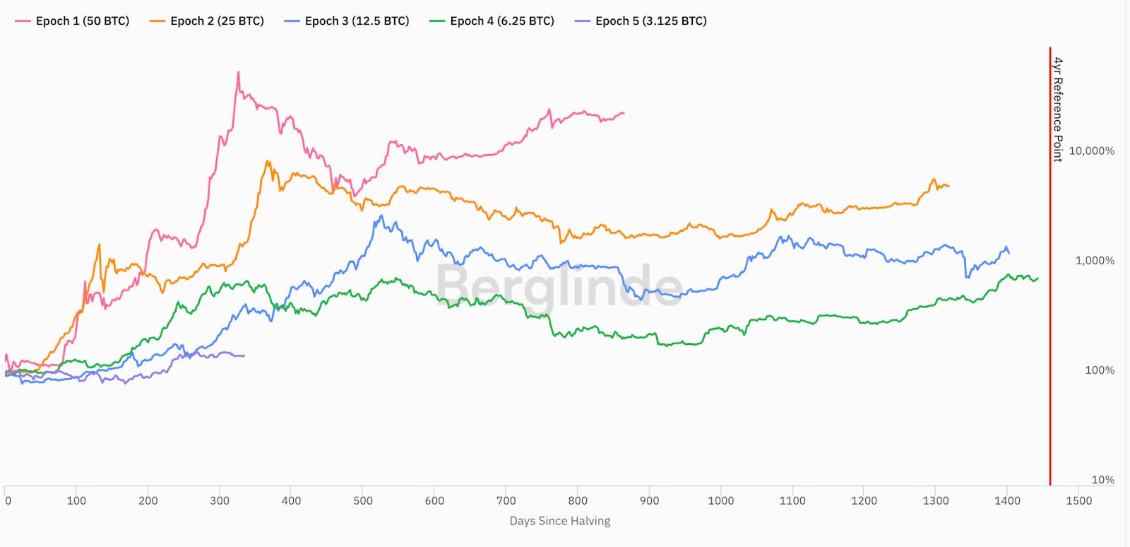 Der Graph der Woche zeigt den kontinuierlichen Rückgang der Preissteigerungen von Bitcoin nach jedem Halving-Zyklus. Wobei der aktuelle Zyklus (begonnen im April 2024 mit 3,125 BTC Belohnung pro Block) geringere Preissteigerungen als die vier vorherigen Zyklen aufzeigt. Dies mag auf den ersten Blick besorgniserregend wirken, ist aber tatsächlich ein Zeichen dafür, dass der Bitcoin-Markt reift.